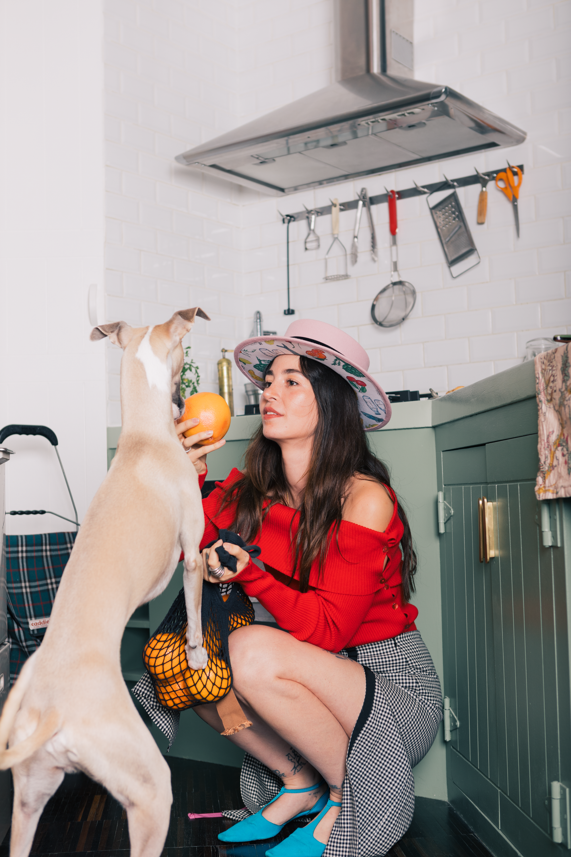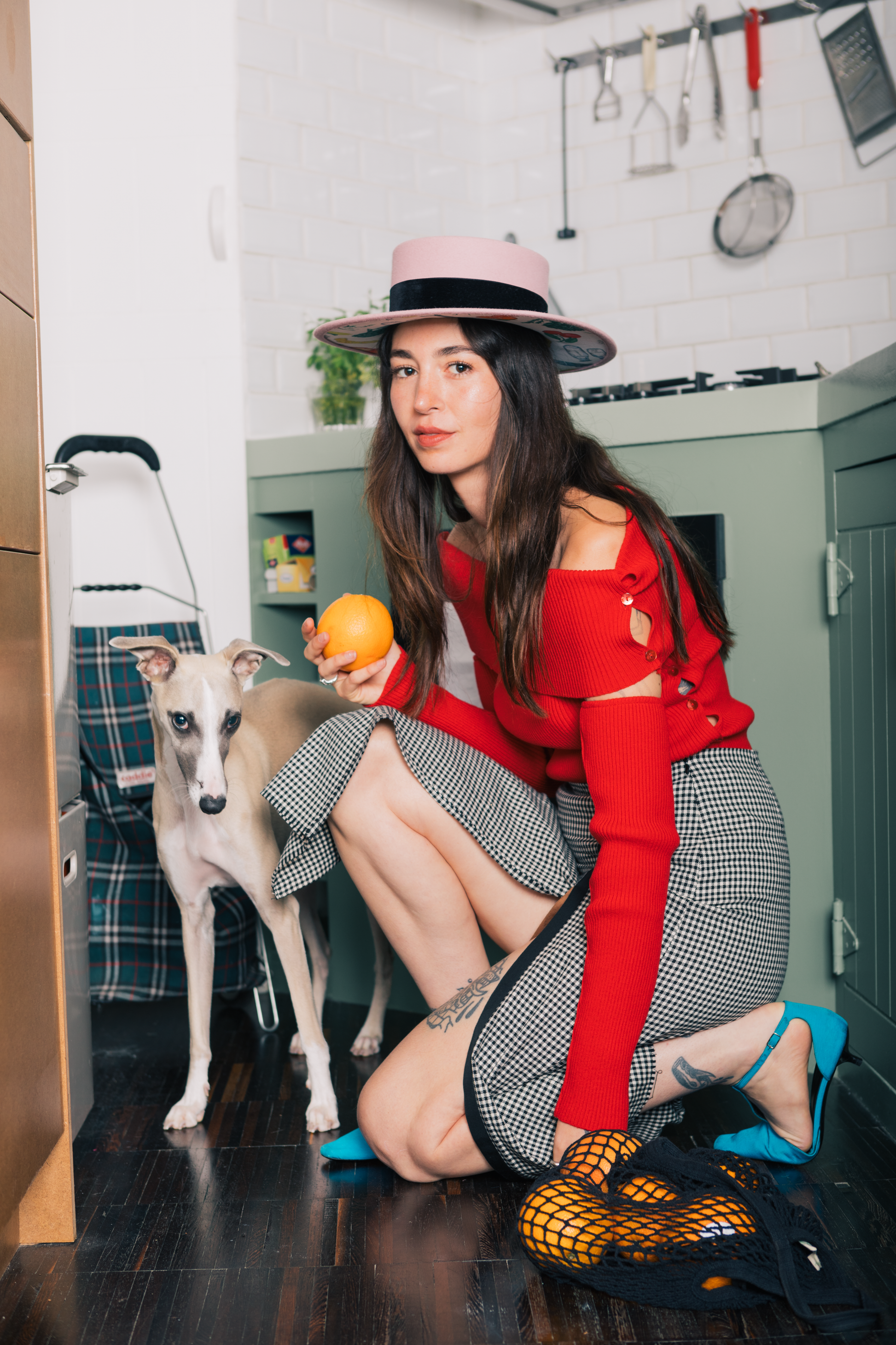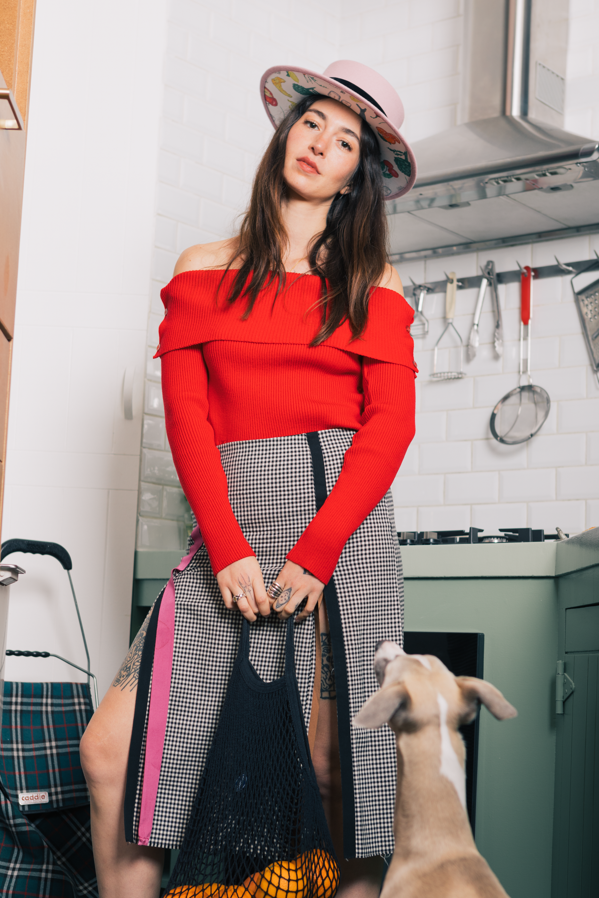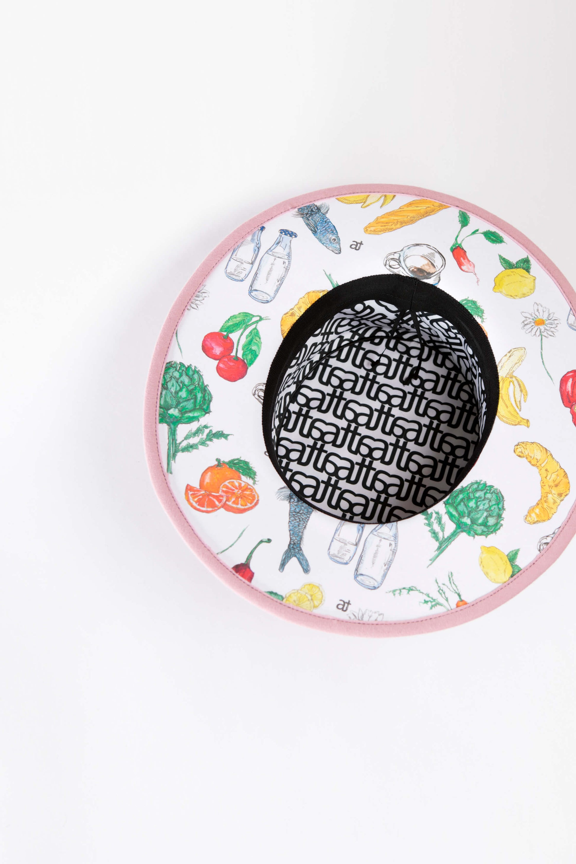 The hat is animated by a “market day” illustration, the theme of the cotton satin collection. Maison at.hats monogram lining in cotton satin.