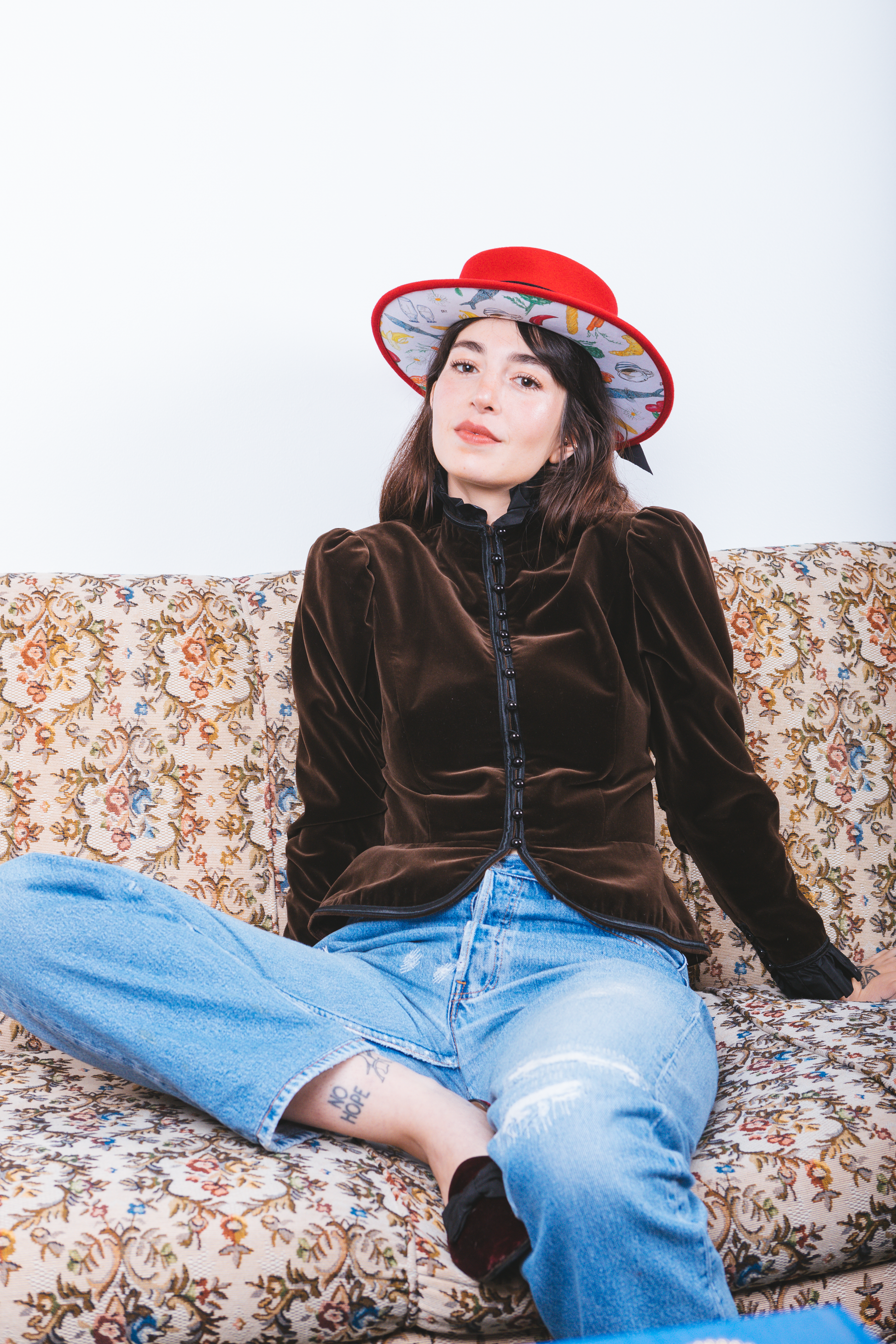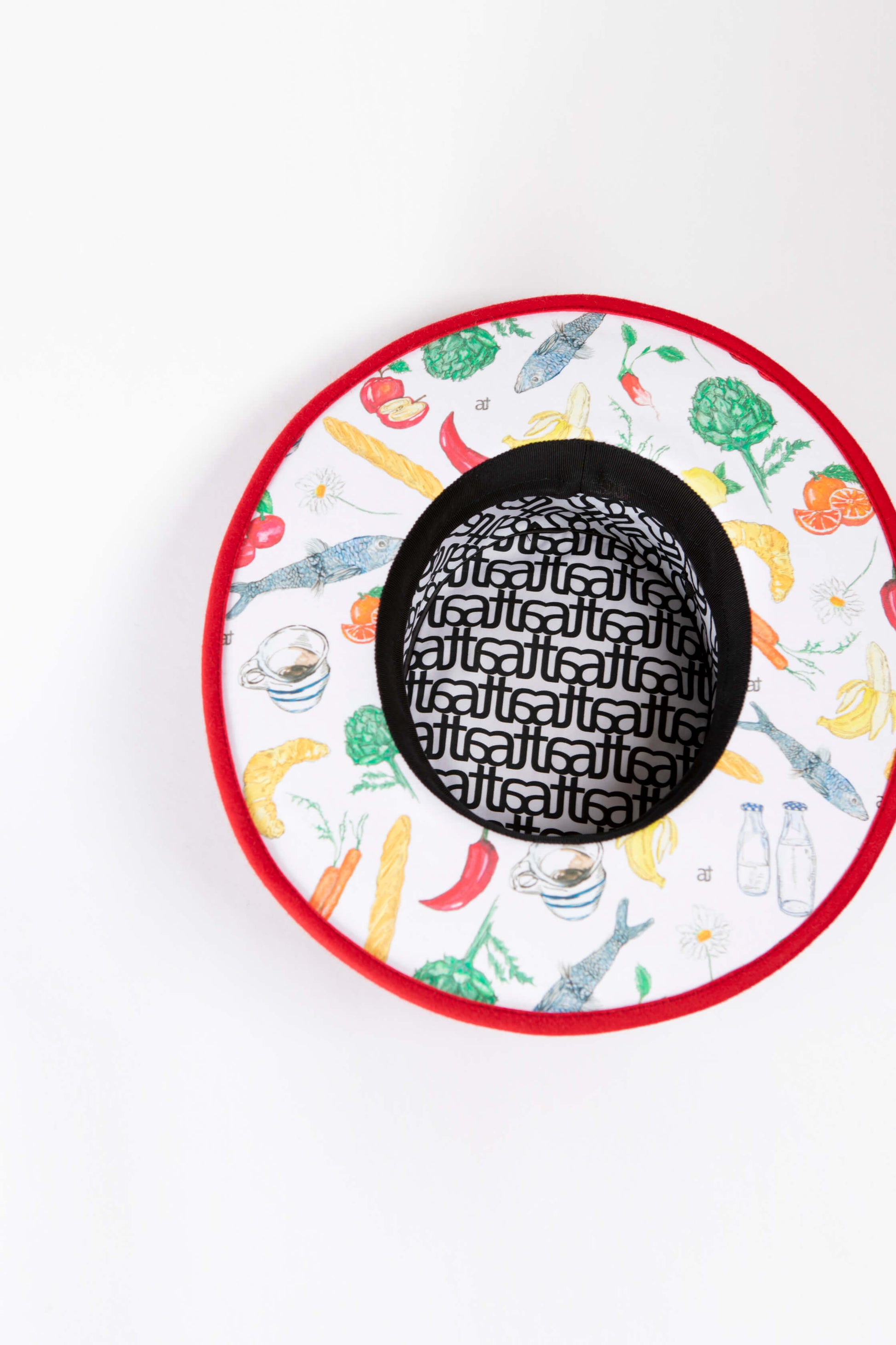 The hat is animated by a “market day” illustration, the theme of the cotton satin collection. Maison at.hats monogram lining in cotton satin.